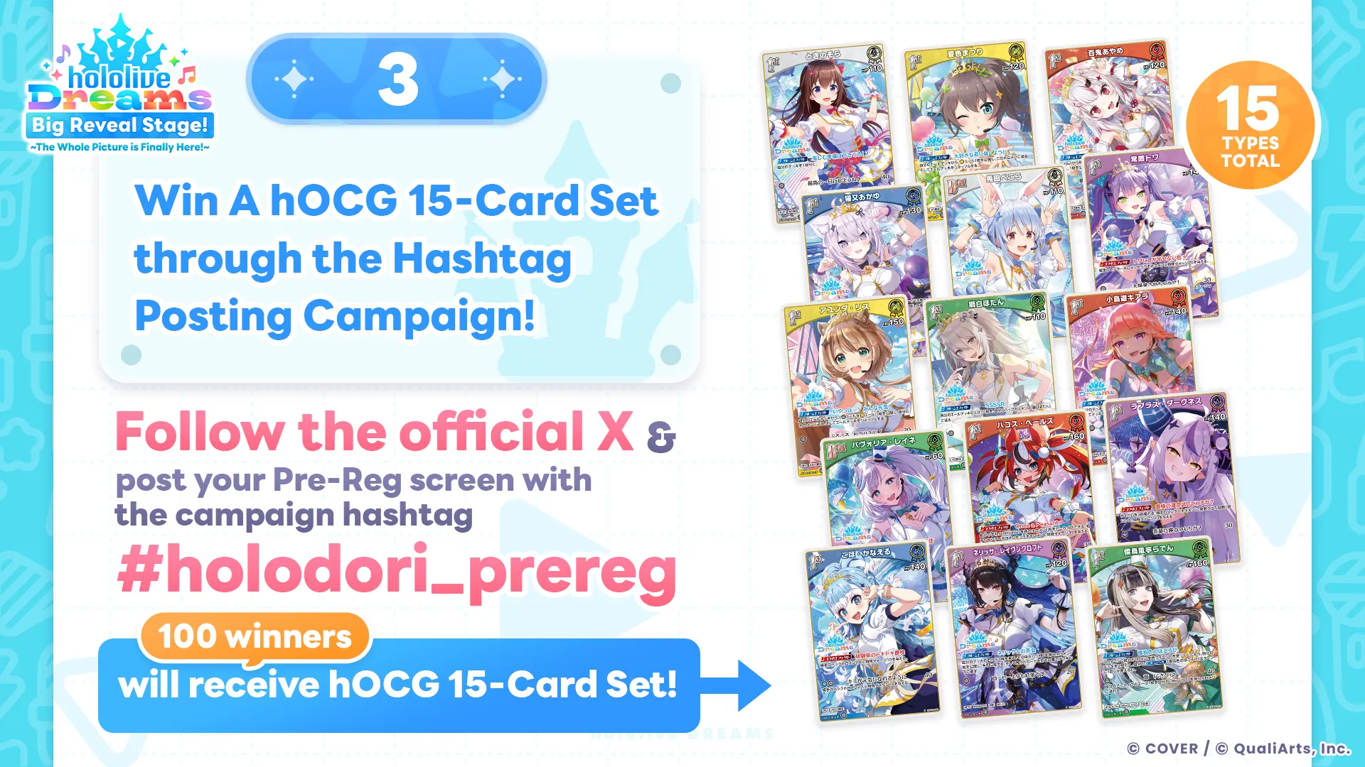 By following the official X account and posting with the hashtag #holodori_prereg, 100 winners will be selected to receive a 15-card set from the hololive OFFICIAL CARD GAME (hOCG).