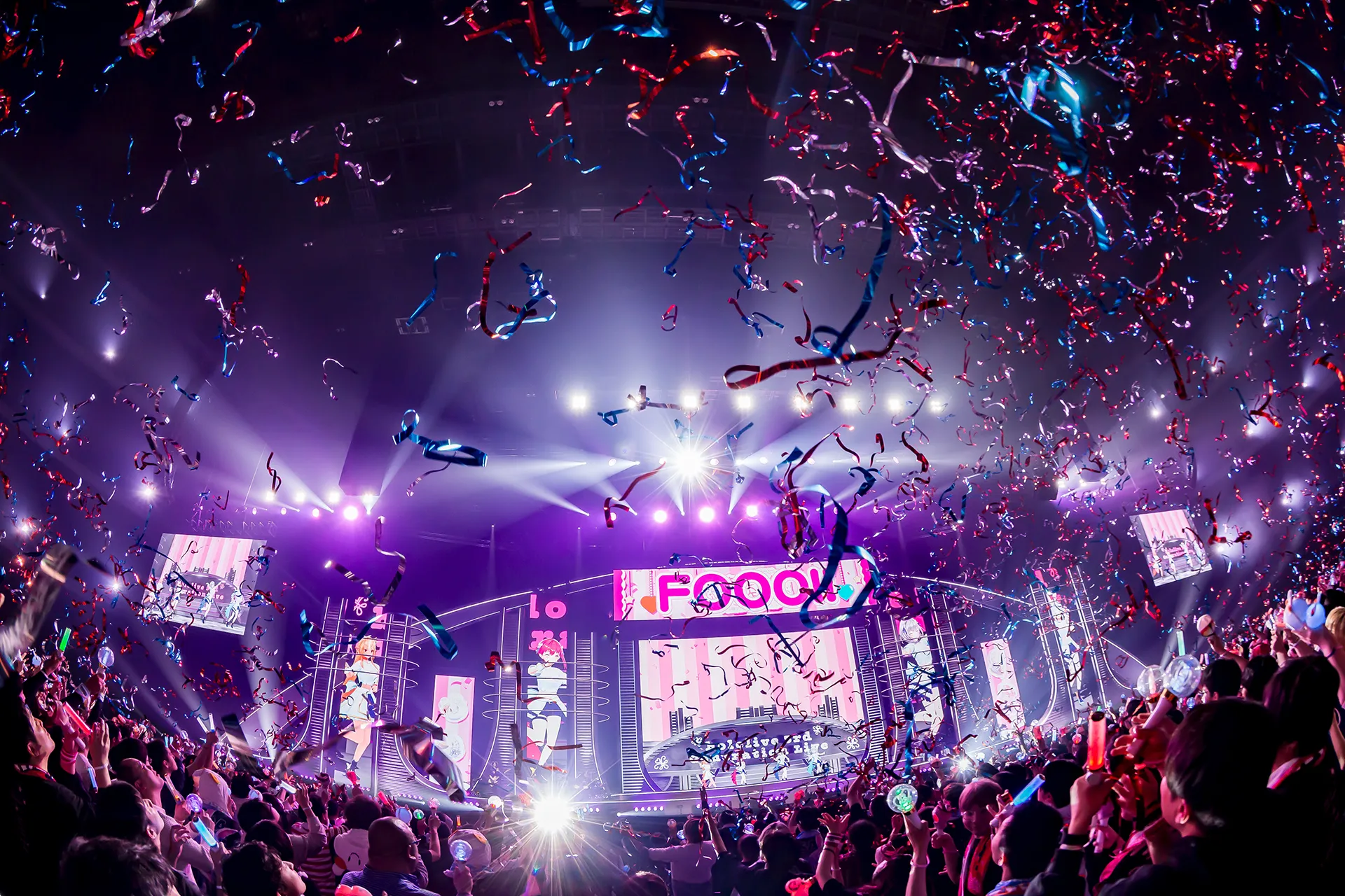 DAY1本編は、ポップチューン「よくばり電脳ガール」で明るく締めくくる。ここまでさまざまな衣装で魅せてきた4人だが、改めてアイドル衣装では赤、水色、オレンジ、グレーのバランスの良い配色が実に鮮やかだ。<後ろまで見えてる><画面の向こうも届いてる>という歌詞はライブでこそ強いメッセージ性を持ち、ぺこら・フレアが「明日も盛り上がっていくぞー!」と叫べば、呼応するように銀テープが舞った。